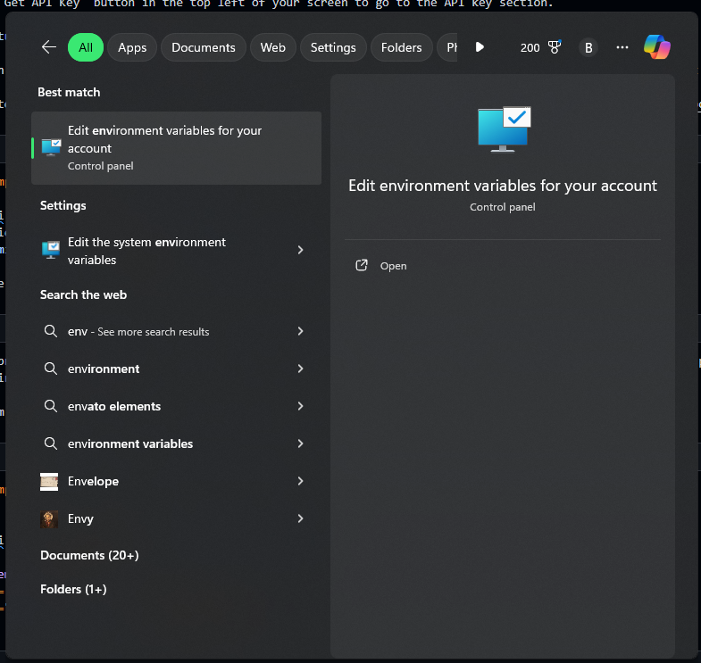 I personally prefer to place my API keys in my environment variables so that I can work with them across different projects. This next bit is specific to Windows users. Mac users can check out this tutorial to set their own environment variables.