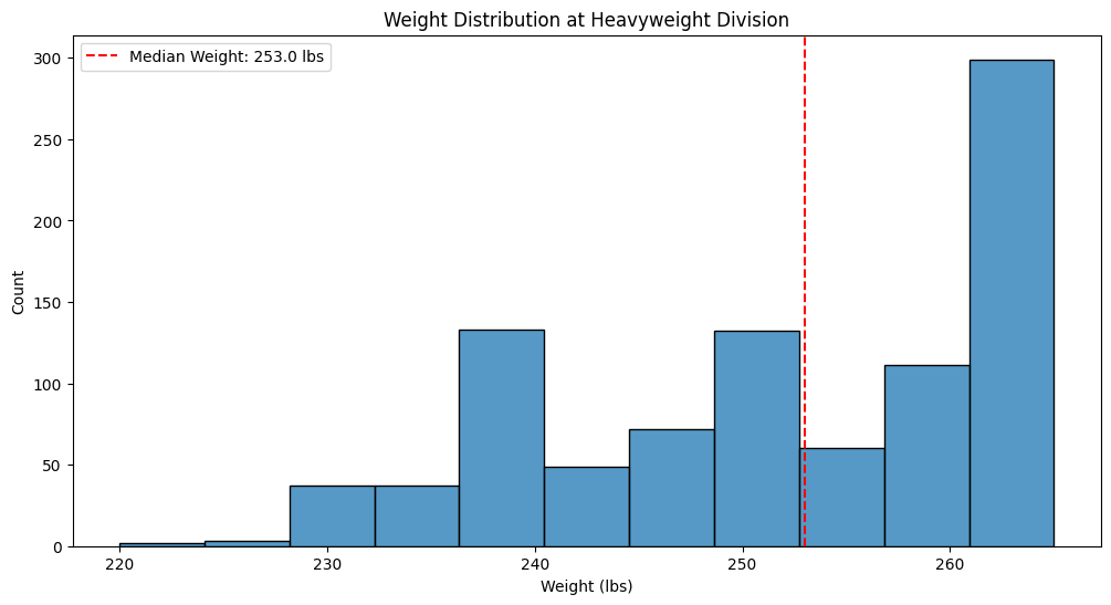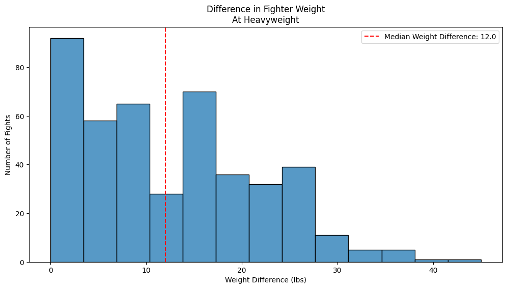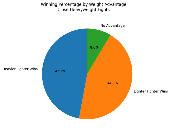 Similar to the phenomenon seen at the women’s featherweight division, we see the same thing when observing the effect of weight at the heavyweight division. The heavier fighter wins more frequently, but betting on them is not a profitable strategy. If you were to bet $100 on the heavier fighter in every heavyweight bout, you would expect to lose $6.31 on average.