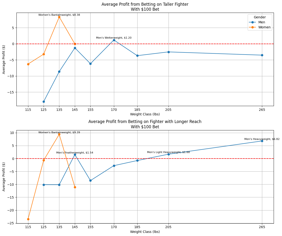 Earlier it was discussed that the winning percentages that stood out when looking at height and reach were to two heaviest weight class for each sex. When betting, of those classes discussed, only the women’s bantamweight division is profitable for both height and reach, the men’s light heavyweight and heavyweight divisions are only profitable by reach, and the women’s featherweight division is not profitable for either. The men’s featherweight division appears profitable for reach and the men’s welterweight division appears profitable for height. Despite the winning percentage of taller and longer fighters being so large for the women’s featherweight division, those fighters must be such large favorites that they are not worth betting on.