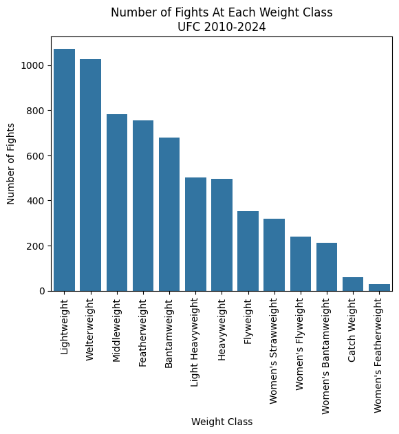 With this data in mind, let’s take a look at how many fights have occurred at each weight class, and a table of the weights for each for reference.