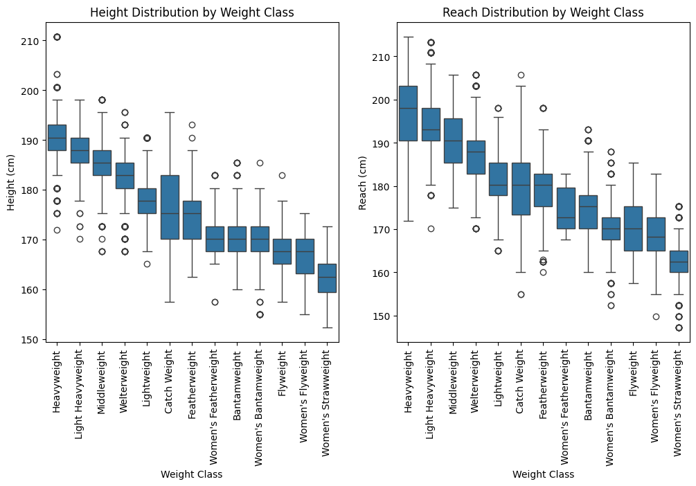 As expected, the distribution of height and reach roughly follows with weight classes - as weight goes up, so does reach and height. I do find it interesting, though, that most of the outliers at the heavier classes are below the class average. This doesn’t say anything to the success of any particular fighter, though, just an observation.