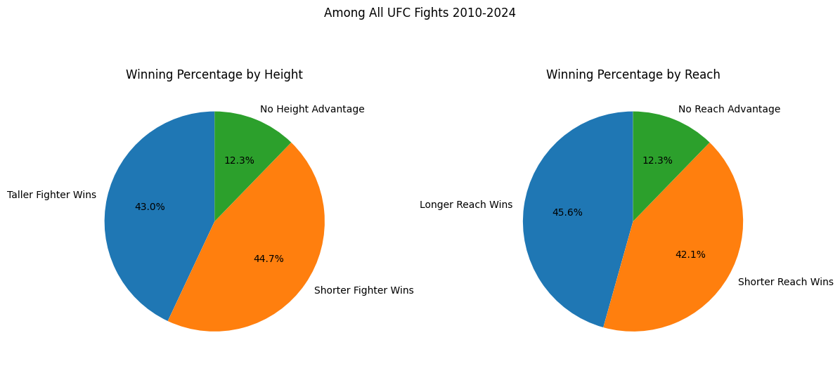 Interestingly, in fights where there is a height difference the shorter fighter wins more often, though the advantage is small. The fighter with the longer reach does win more frequently, but again, the advantage is tiny. As previously mentioned though, actual fight skill is most important. There are many fights in here that, on paper, are slated to be one-sided affairs.