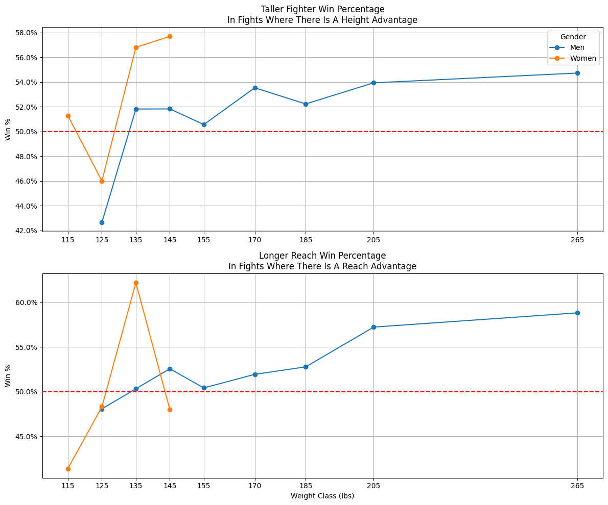 It’s interesting to note that these are the two heaviest divisions for both men and women. In fact, the trend seems to be that as the weight increases for the fight, height and reach become more important.